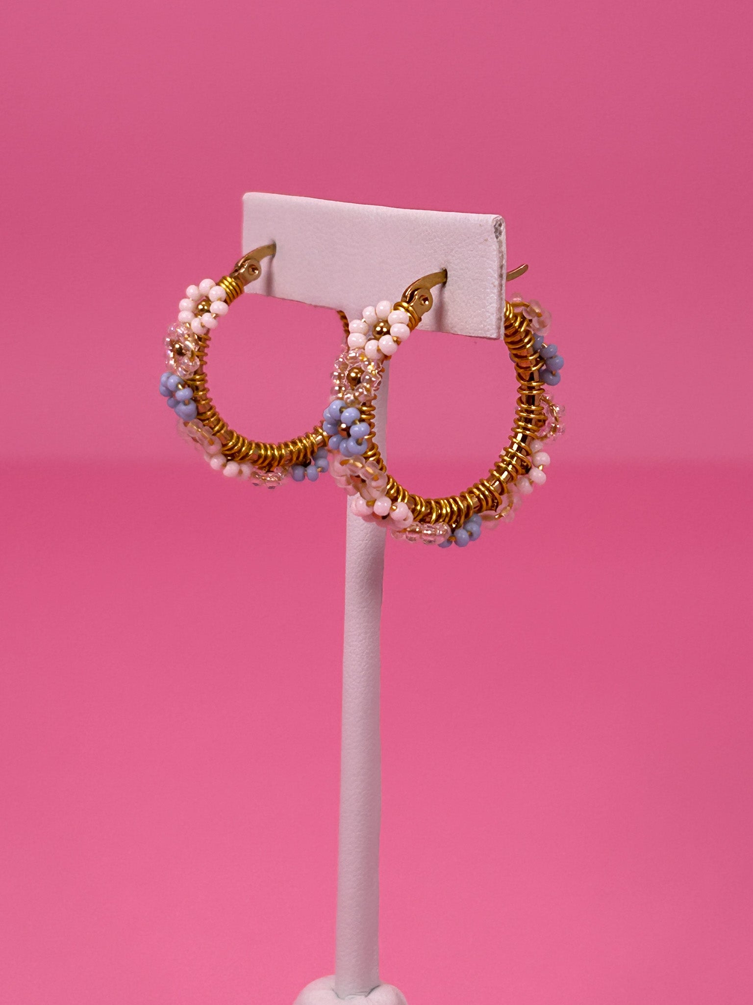 Handcrafted 25mm stainless steel hoop earrings with vibrant seed bead daisies and golden accents. Lightweight, durable, and full of personality, perfect for everyday wear or gifting.