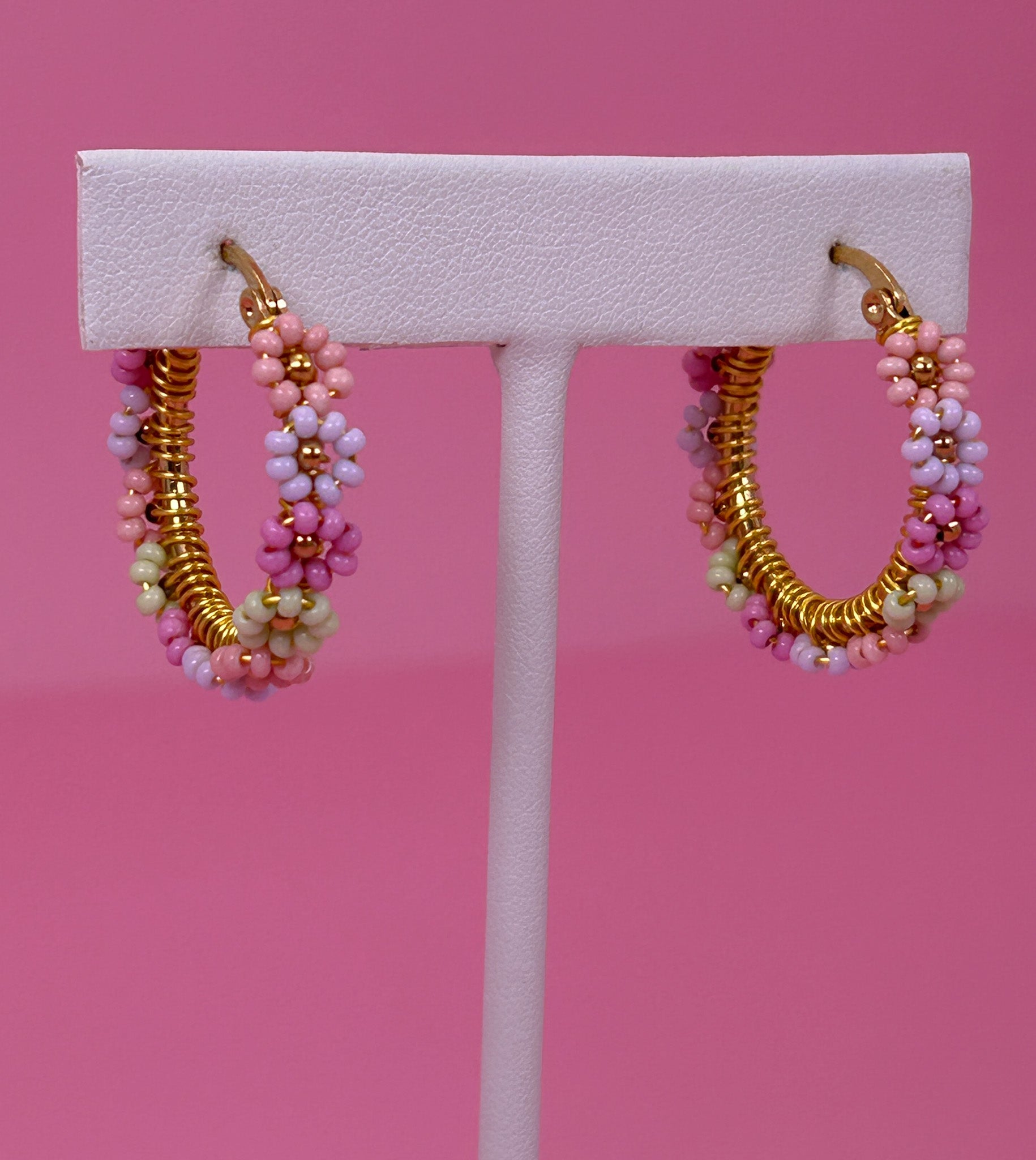 Handcrafted 25mm stainless steel hoop earrings with vibrant seed bead daisies and golden accents. Lightweight, durable, and full of personality, perfect for everyday wear or gifting.