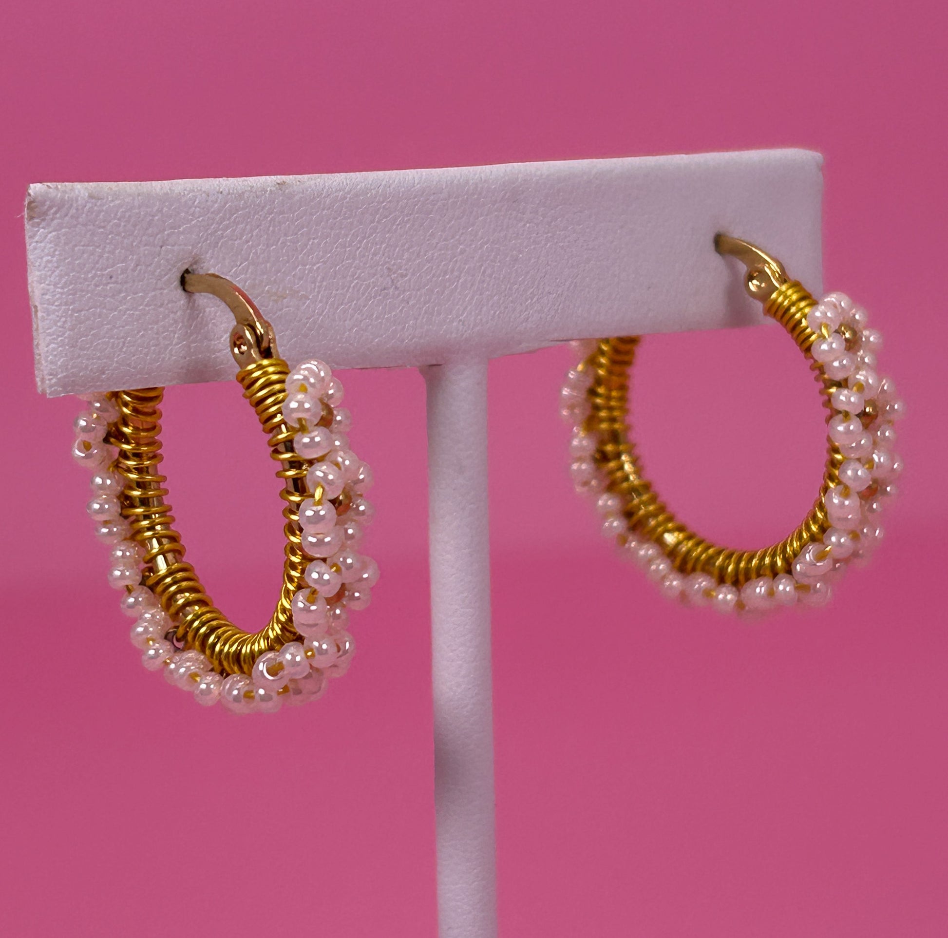 Handcrafted 25mm stainless steel hoop earrings with vibrant seed bead daisies and golden accents. Lightweight, durable, and full of personality, perfect for everyday wear or gifting.