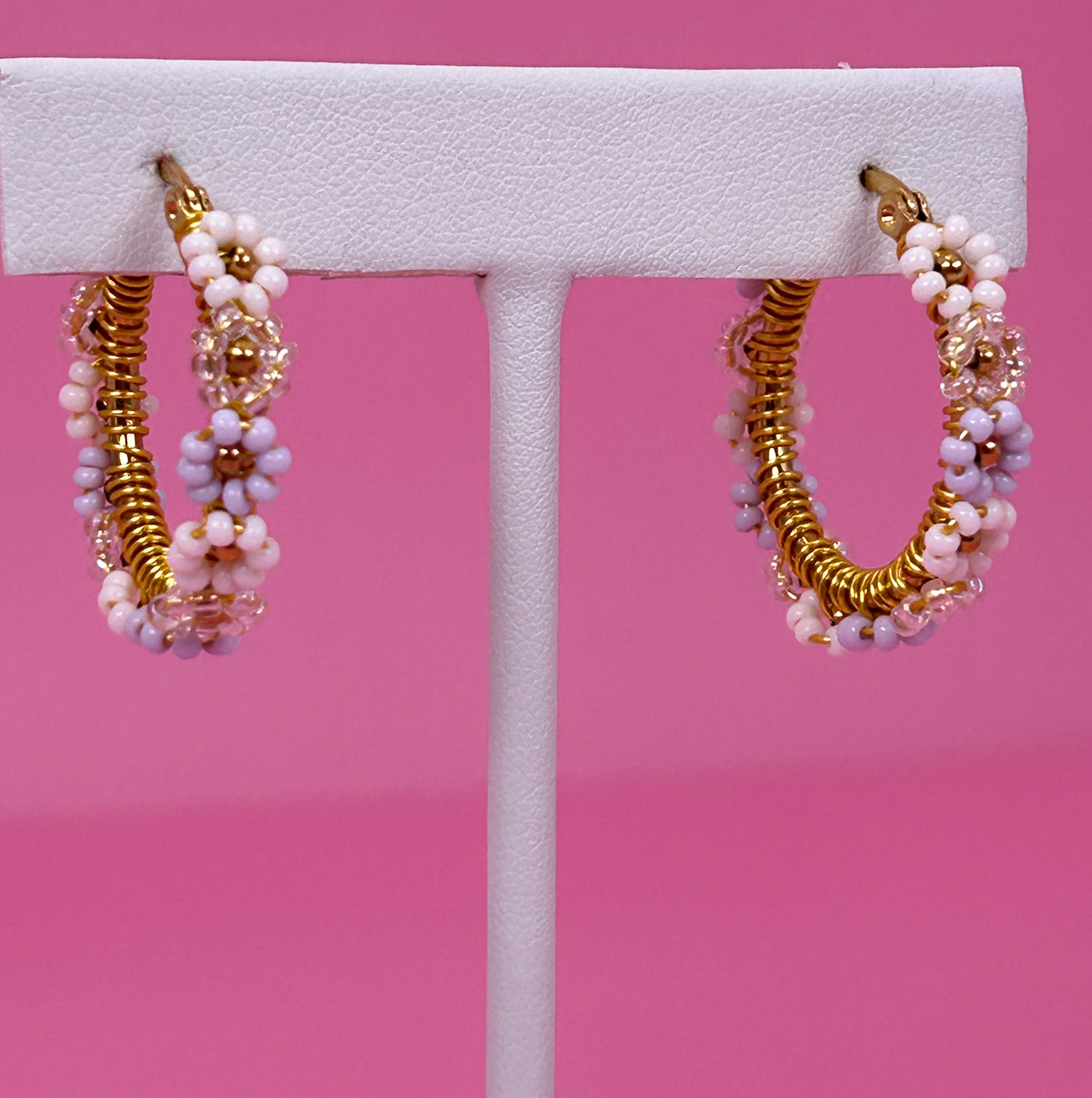 Handcrafted 25mm stainless steel hoop earrings with vibrant seed bead daisies and golden accents. Lightweight, durable, and full of personality, perfect for everyday wear or gifting.