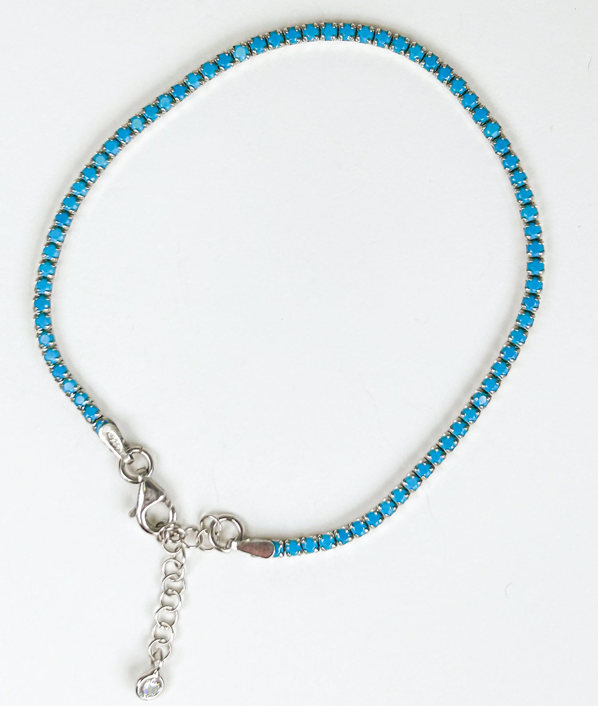 Delicate sterling silver tennis bracelet adorned with sparkling sky blue stones, adding a serene and elegant touch to any look.