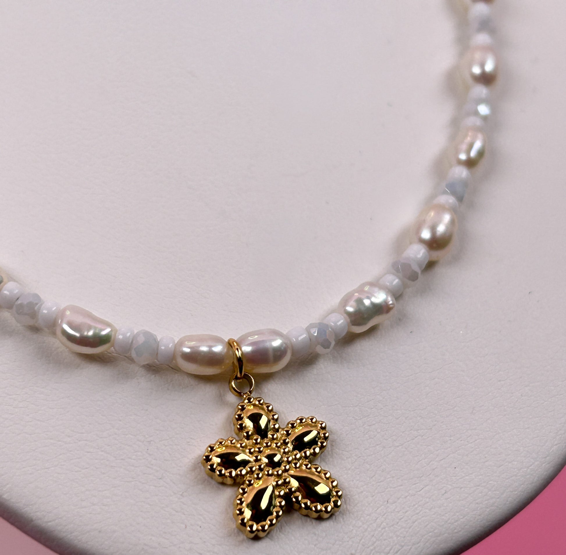 Elevate your everyday style with this delicate handcrafted necklace featuring a gold stainless steel flower pendant paired with a beautiful mix of freshwater pearls, shimmering crystals, and seed beads. Designed to bring a touch of elegance and sparkle to any outfi. Perfect for layering or wearing on its own, it’s a versatile accessory for any occasion.